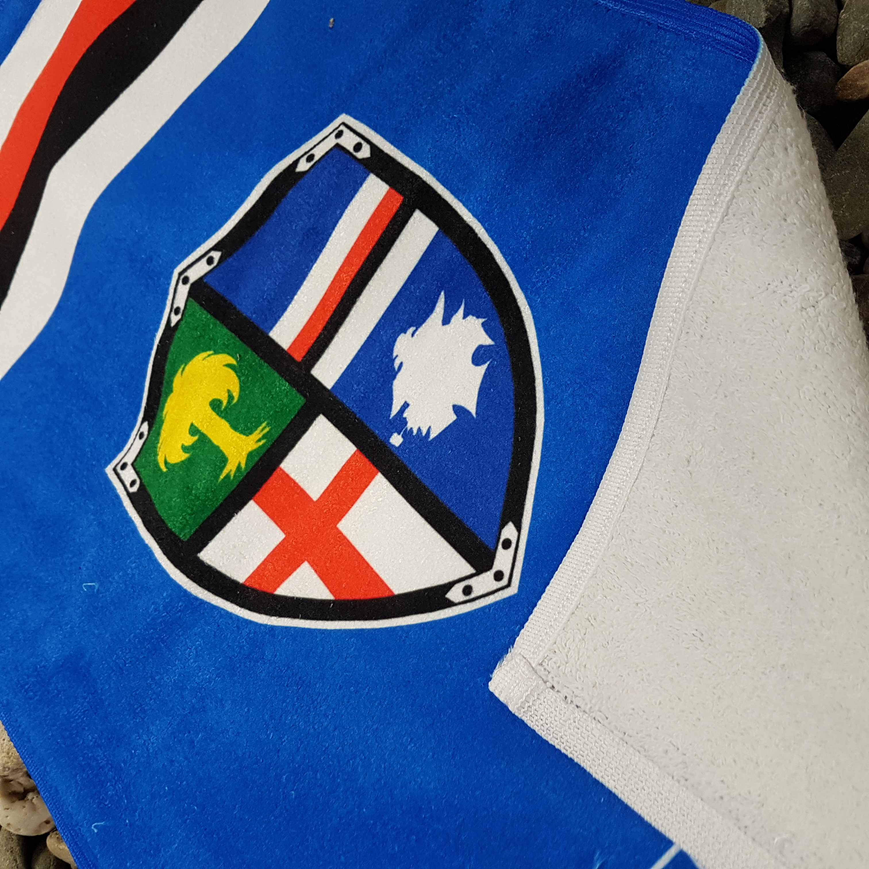 Bath towels are made of two layers. The front side is loopy polyester, fully printable; the backside side is also loopy but made of cotton and absorbs water well